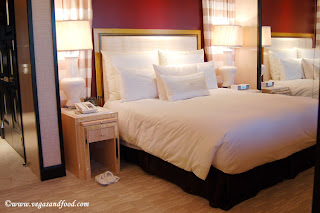Encore Las Vegas hotel room. It's very nice. Rooms are close to elevators. Everyday, there were 2 complimentary bottles of water on the desk. We stayed 3 nights and I was very tired, but I couldn't have deep sleep at all. Maybe the bed or pillow wasn't so comfortable for me. It looked fine to me, but I was keep waking up every hour every night. Also the Encore has a big menu of the room service (but expensive).