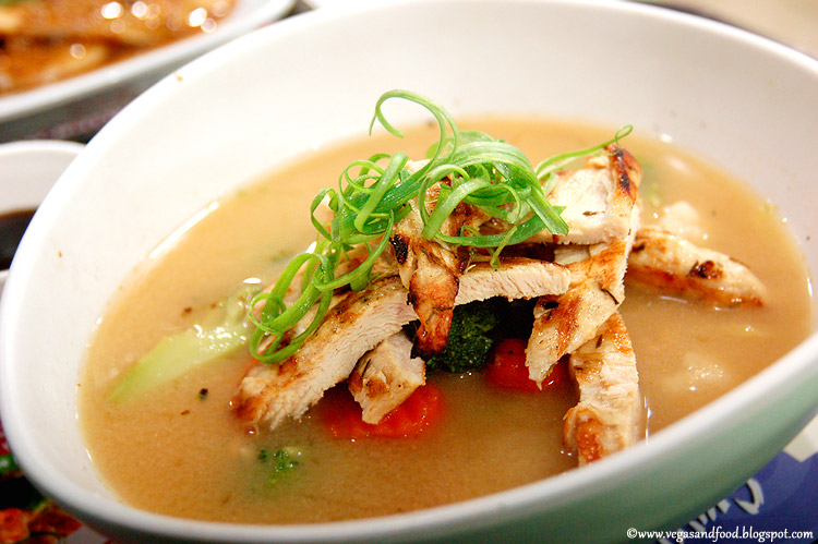 Lightly sweet shiromiso base served with a grilled rice cake (yes, there was grilled rice cake in the soup, under chicken) and fresh vegetable medley. Topped with scallions. Another one of my favorite.